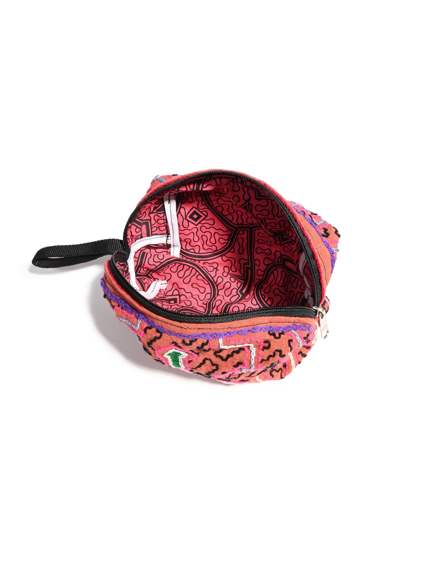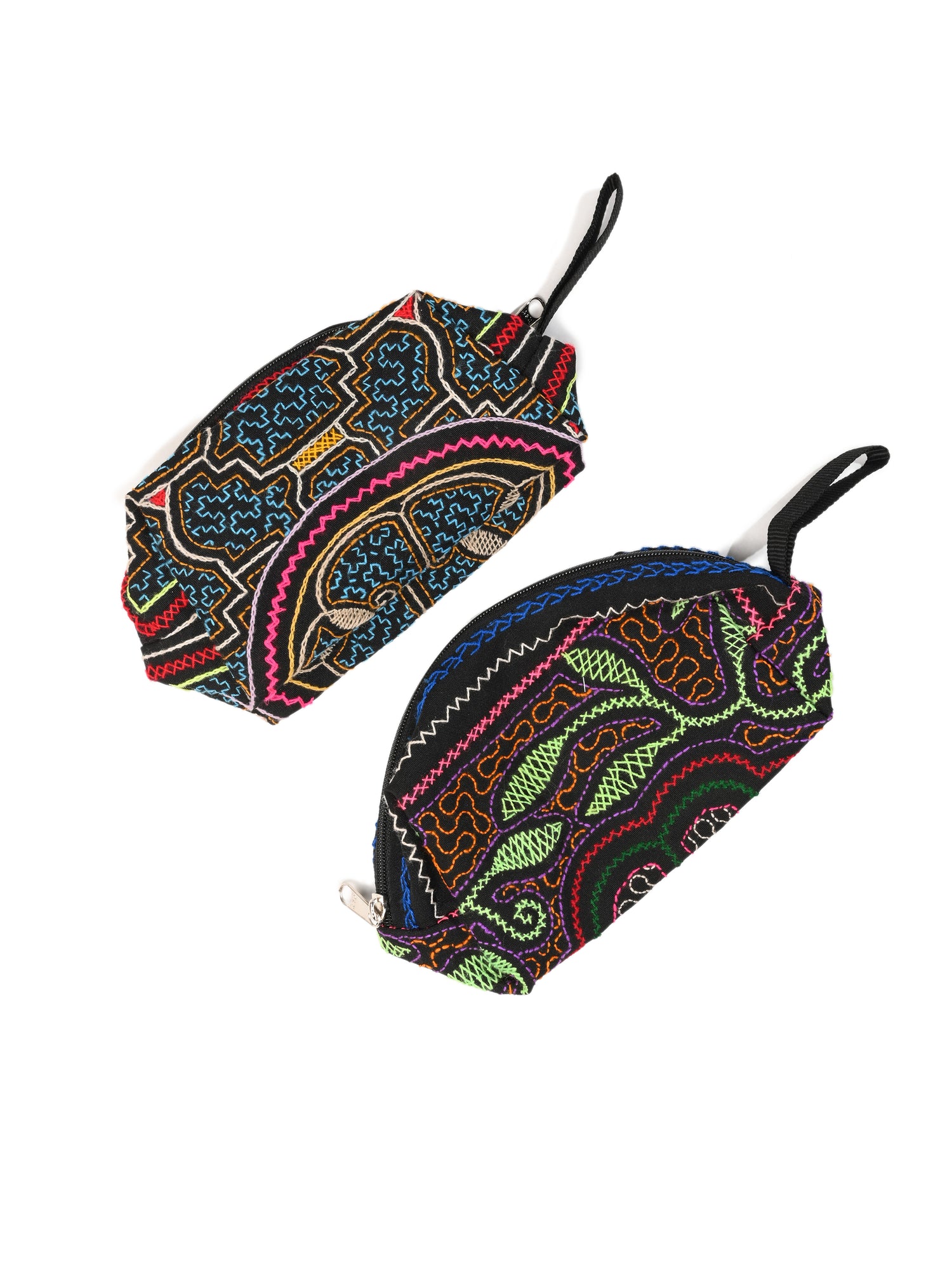 Choice of color family. The design on the bag may slightly vary, but all are hand stitched and beautifully unique. Convenient black 4" wristlet hand strap. Zipper color varies from navy blue, brown, or black.
