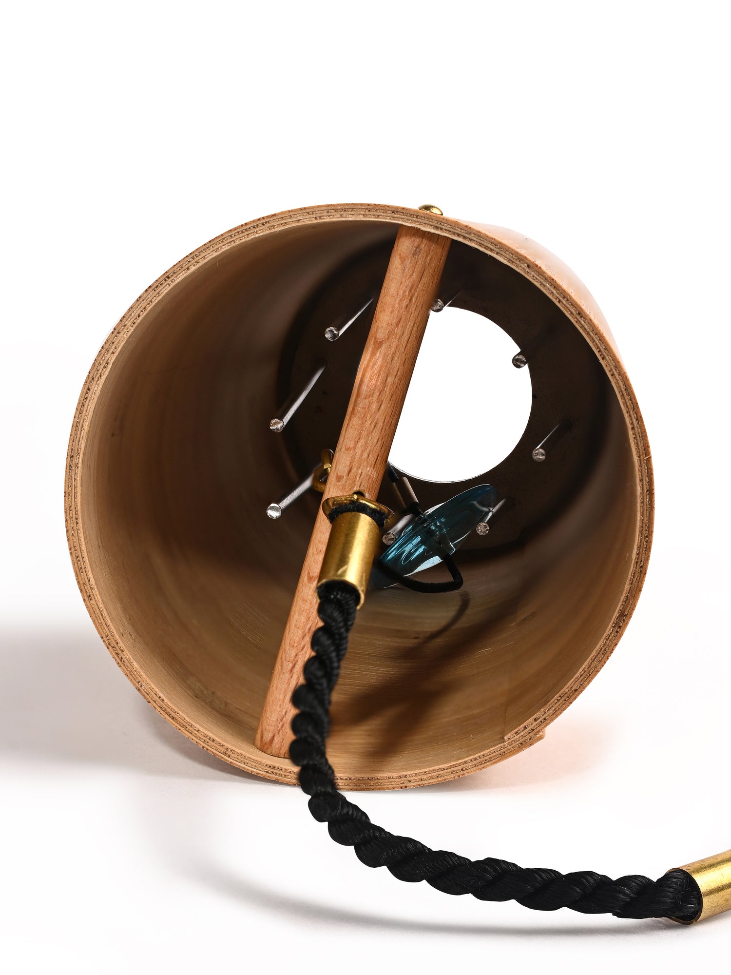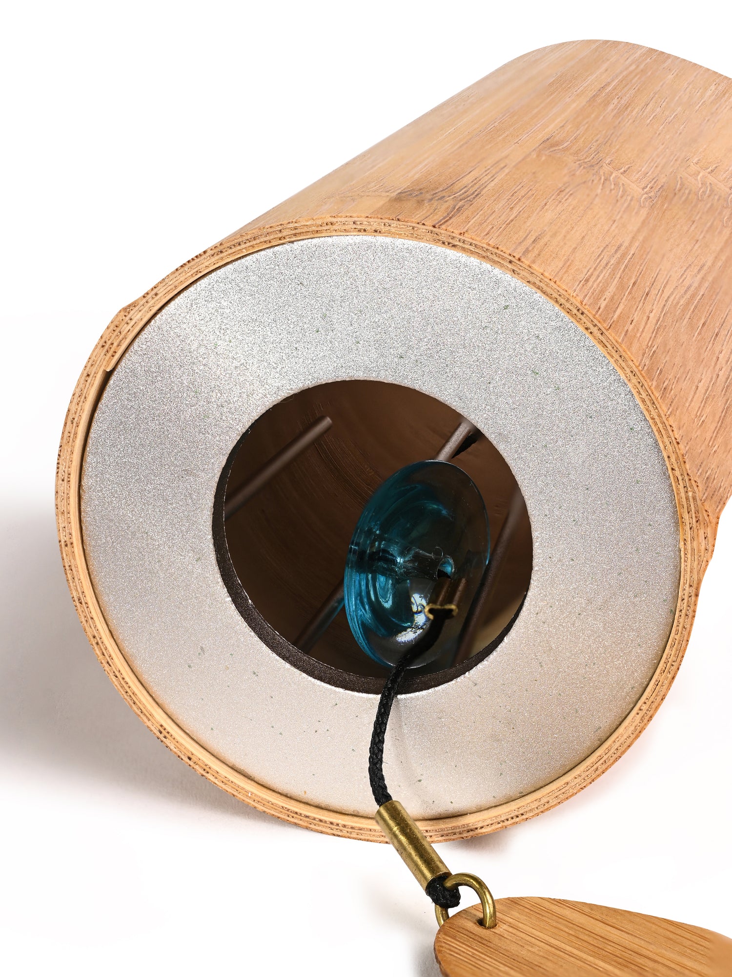 Eight chime-rods are welded with silver into the metal plate at the base of the resonance tube. Precise tuning creates a play of clear tones that is rich in overtones. The overtones of the shorter chime-rods gradually dominate and become fundamentals, thus forming a circular tone range. The cylinder, a resonance tube of high acoustic quality, is made in our workshop with thin layers of bamboo and is treated with natural oil. Bamboo has been used since ancient times for musical instruments. The cylinder is 6.3 cm in diameter and 16.5 cm high.