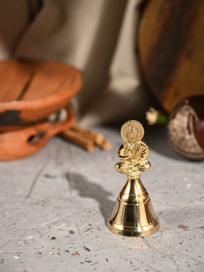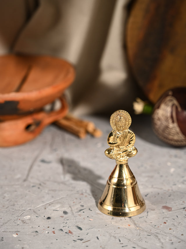 Crafted in India this small solid brass bell has a clear sweet sound. The handle features Lord Buddha. A bell is traditionally rung to signal the start and end of a meditation session, to mark the passing of the Dharma from teacher to student, and to call the attention of the deities and spirits.