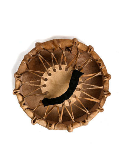 Hand-held Native American Inspired hoop drums are perfect for drum circles, shamanic healing, meditation, and personal or ceremonial rituals. The drums are laced onto 2.5" tall maple frame with a separate piece of rawhide for even pressure, preventing tearing. The drum handles are wrapped in leather and made to slide your hand underneath so it fits like a glove!