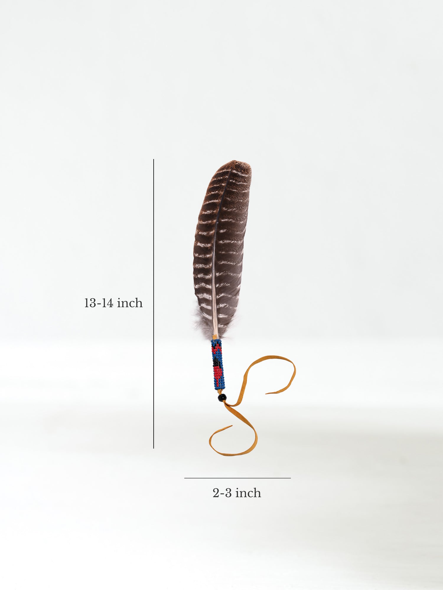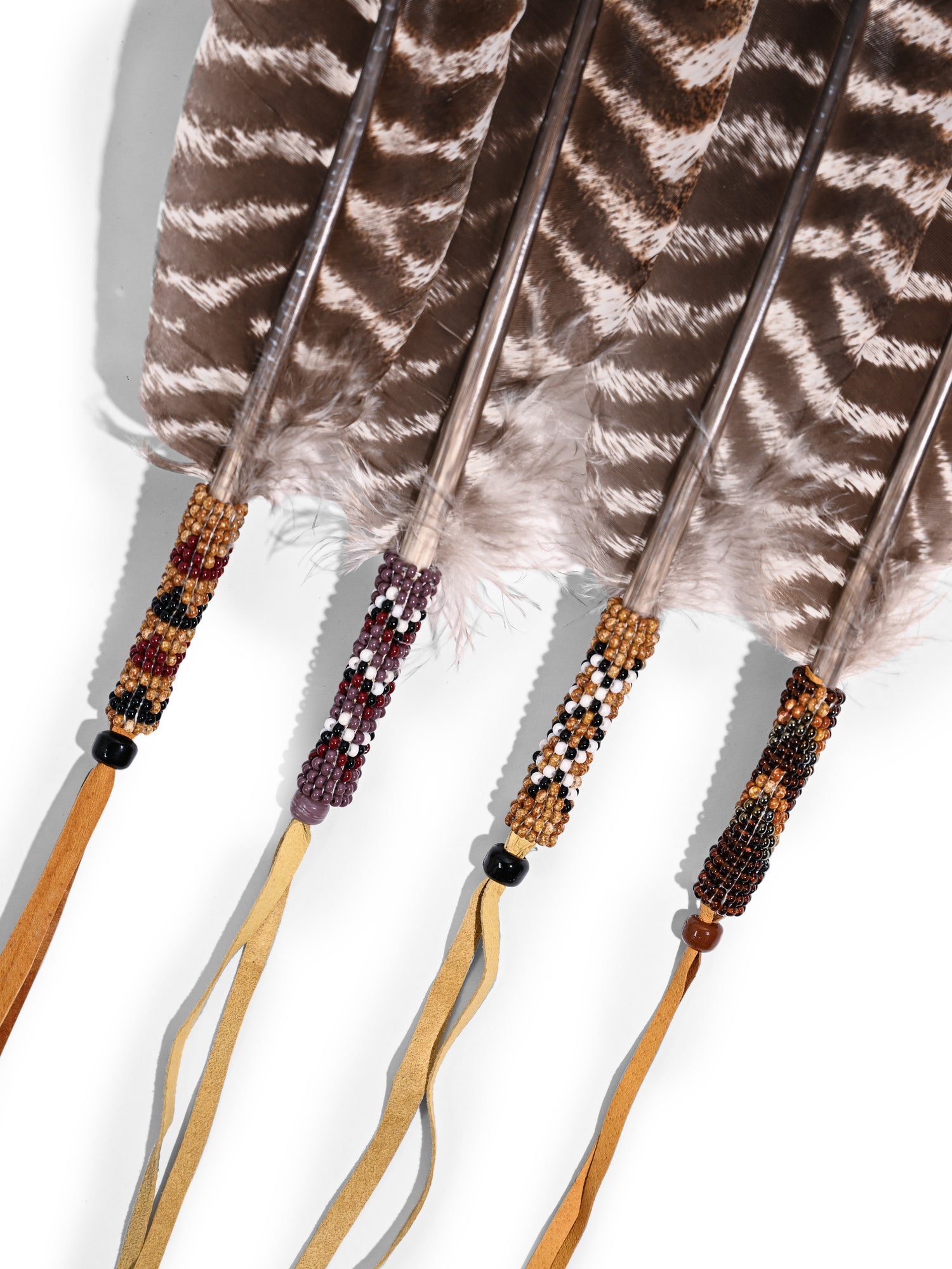 Lift your fragrant and/or smoky offerings up to the heavens with these Smudge Feather Fans created by people of the Navajo tribe. Constructed with a bead-wrapped handle and hanging leather tassel at the base.