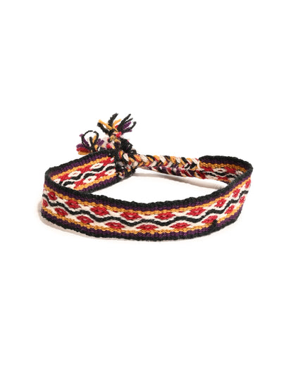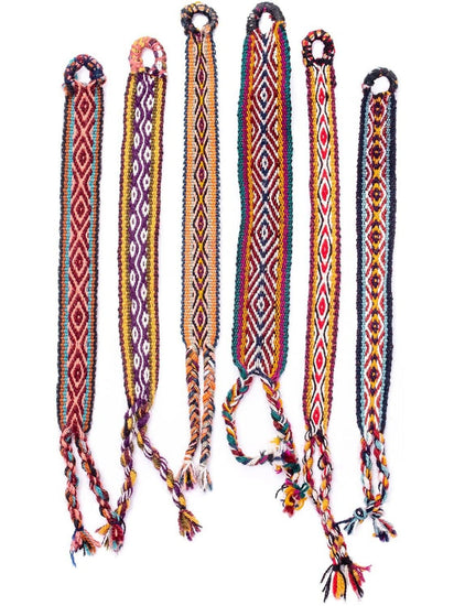 Handmade woven bracelets featuring natural dyed yarns in the traditional style of the Awamaki. Loop and tie closure. Bracelets range from 5.75 to 7.5 inch long and 0.5 - 1 inch wide. Picture shows some of our color and style variations. Let us choose one or more for you. Sold individually. Handmade in Peru.