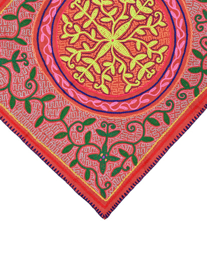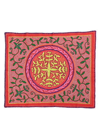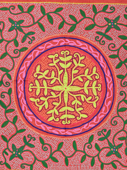 "The intricate pattern embroidered on this cloth is a song-pattern. Song patterns are geometrically fractal designs, tiny stitches, make up the background patterns were explained to be representative of the cosmic oneness. To the Shipibo, this oneness very literally connects all things in the universe. Over the top is the main song line, and these patterns are recognized holistically by the shaman as the main identifying characteristic of the corresponding icaro. When I observed the shamans singing a cloth, they would trace their index finger along this main song line pattern, the melody rising or descending in general accordance with the rise and fall of the line. Along the main song line itself and at various points of intersection along its path, can be seen the beautiful geometric designs called the floras. These flowers represent turning points where the song may take a new direction, such as a new verse or chorus."