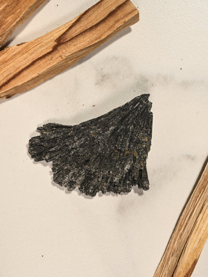 Black Kyanite is known as a protection talisman. This stone enhances psychic abilities, heals the body and repels negativity. A grounding crystal that does not need to be cleaned, it works as a powerful amplifier of energies. Black Kyanite will help ground and protect you while keeping you at a high frequency. Known also as the witch's broom, due to it's fan shape and use for sweeping away negative energies. Some choose to keep it in their car for safe travels.