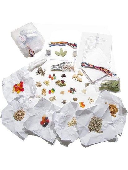 We have reduced the number of plastic bags used in the kit and now use recycled paper to wrap the ingredients. The kit now comes in a recycled plastic container and includes: Alphabet Pasta, Amaranth, Corn, Oatmeal, Rice, Animal Cracker Cookies, Bay Leaves (3 sets of 5 kintu's each) and Sage Mix (w/tobacco & scallop shell), Assorted Candy, Carnations (red, white & yellow), Confetti, Cotton Balls, Feathers, Folded Paper, Rainbow Tissue Paper, & Ribbon (gold & silver), Garbanzo & Lima Beans and Peanuts, Incense, Lavender, Money (play), Raisins, Starfish, Stars, Sugar, Sunflower Seeds, Twine, Wine (red & white)