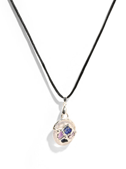 The Dai Ko Myo gem drop pendant is created from chariote, dumortierite, lapis, and amethyst.