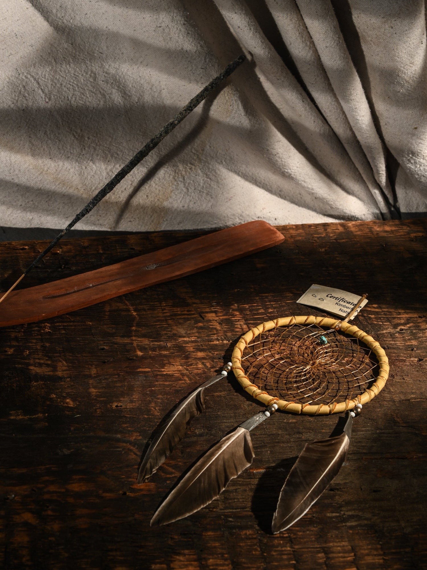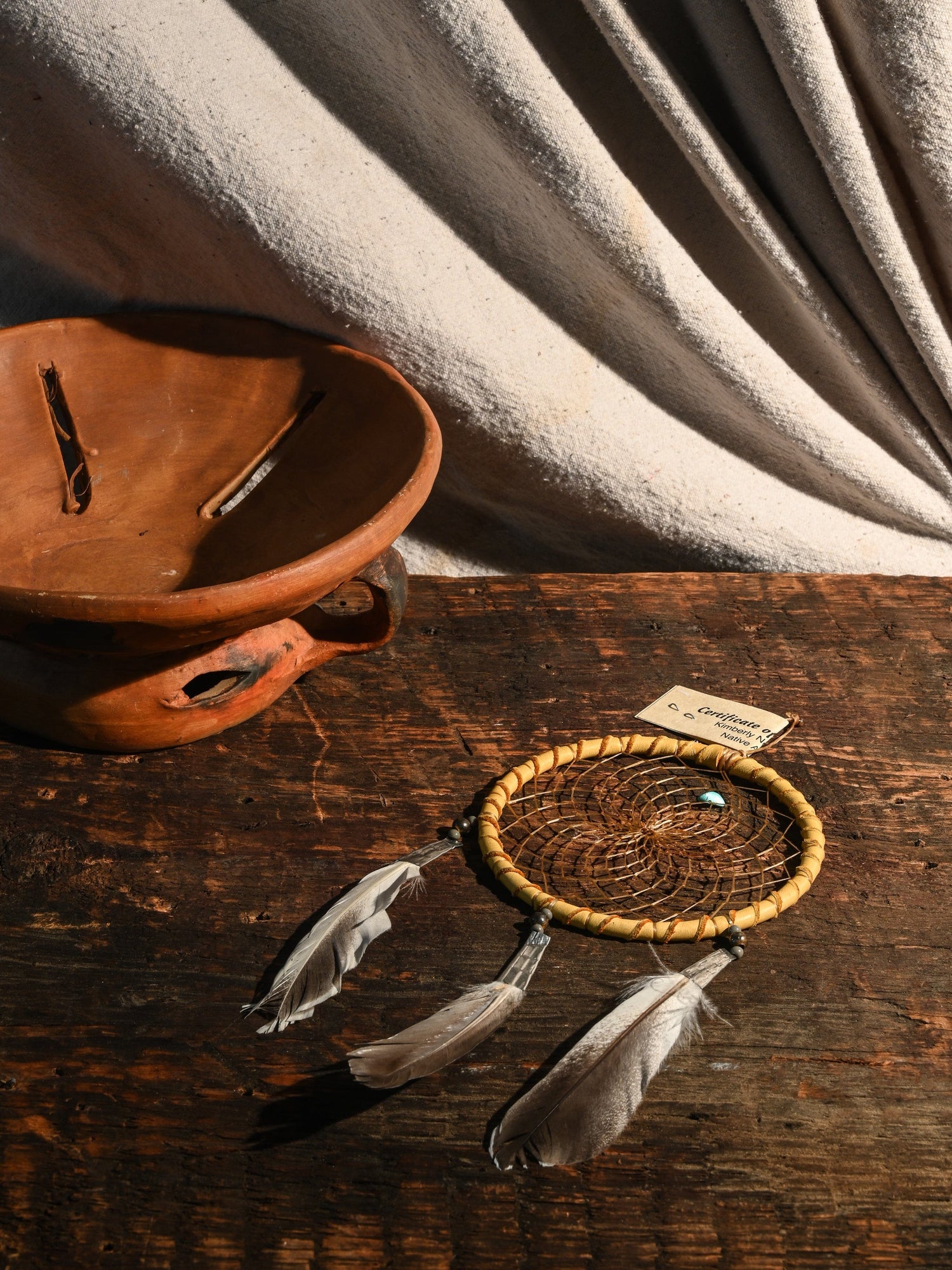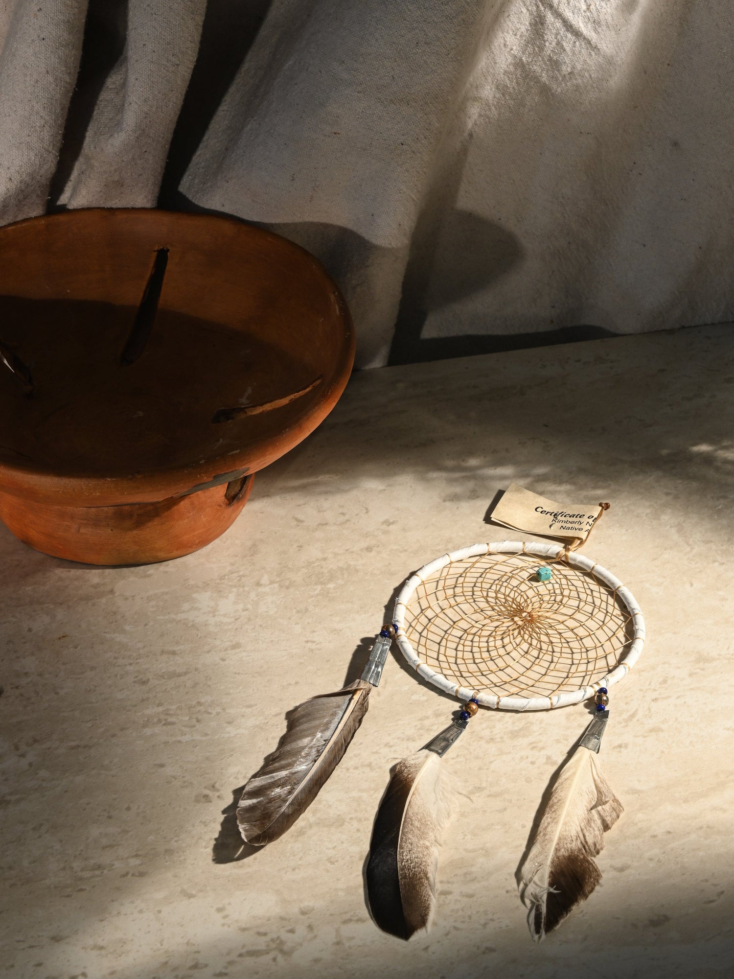 Each dreamcatcher captures the beauty of the sacred legend. Some of the materials have an authentic aged look. Feather color can slightly vary. Web contains small turquoise stone which represents life. Handmade by Kimberly Notah of the Navajo Tribe. Certificate of Authenticity included.