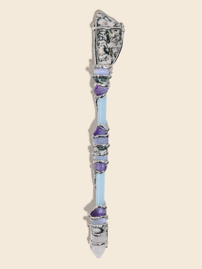 Tree Agate encourages inner peace through certainty. Brings awareness of personal strengths, thus creating security and stability. Blue Lace Agate bestows peace, fortitude, happiness and security. Calms and soothes the nerves thus reducing inner tension. Helps with family conflicts. Chalcedony calms hysteria, lifts depression, and wards off negativity. Amethyst is said to be soul cleansing. Amethyst works on many levels bringing clarity through wisdom, courage and spiritual guidance. Clear Quartz activates and directs the positive energies while dispelling negativity. All Medium wands are approximately 6 to 7 inches long. Each item is individually hand crafted. All medium and large wands come velvet pouch and information card.