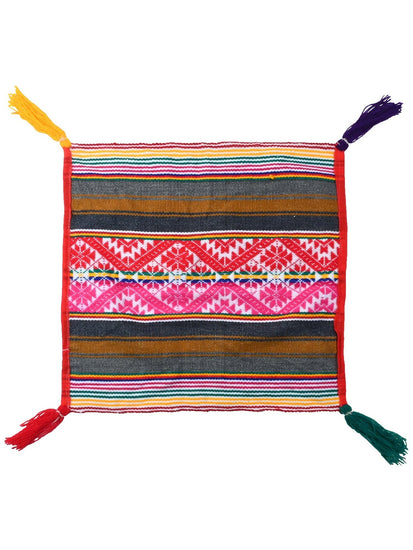 Colorful despacho cloth woven with fibers in bold stripes of bright colors and wider stripes of natural earth tones. Handwoven by skilled artisans using traditional techniques passed down through generations. It is made from high-quality alpaca wool, which is soft, durable, and hypoallergenic. The cloth is adorned with intricate patterns and symbols that have deep cultural significance and represent the natural world and the forces of the universe.