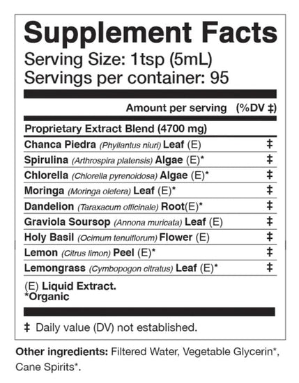 Ingredients: Spirulina,* Chlorella*, Dandelion leaf^, Moringa*, Chanca Piedra^,  Rama Tulsi*, Graviola, Lemon Peel*, and Lemongrass*, extracted in cane spirits*, vegetable glycerin* and filtered water.