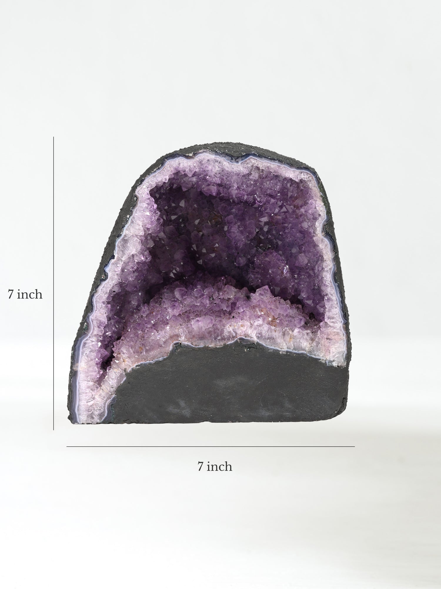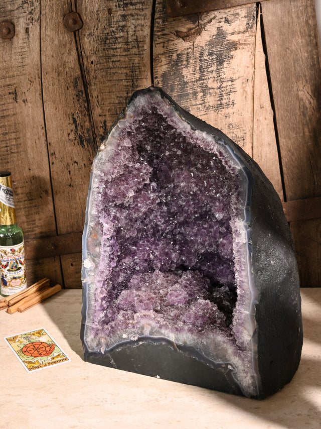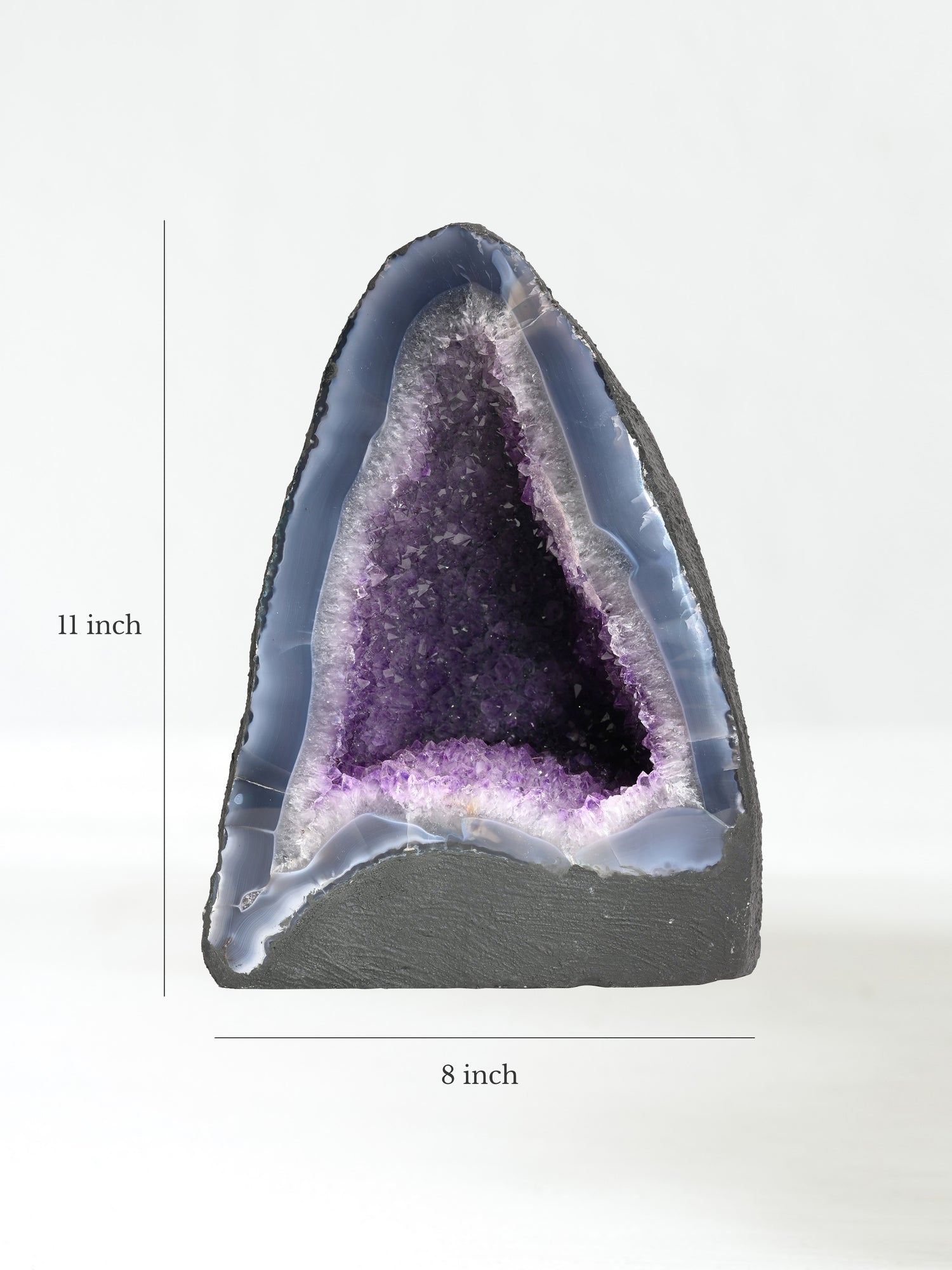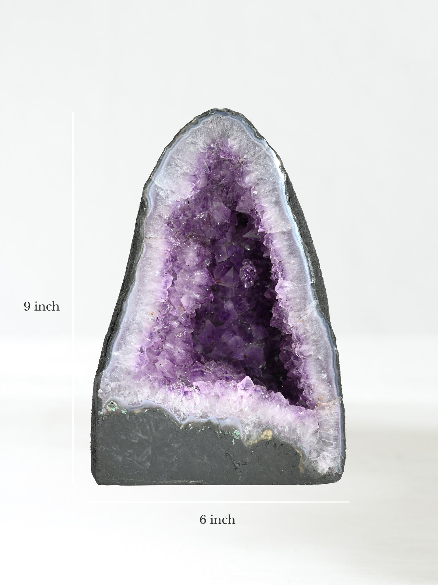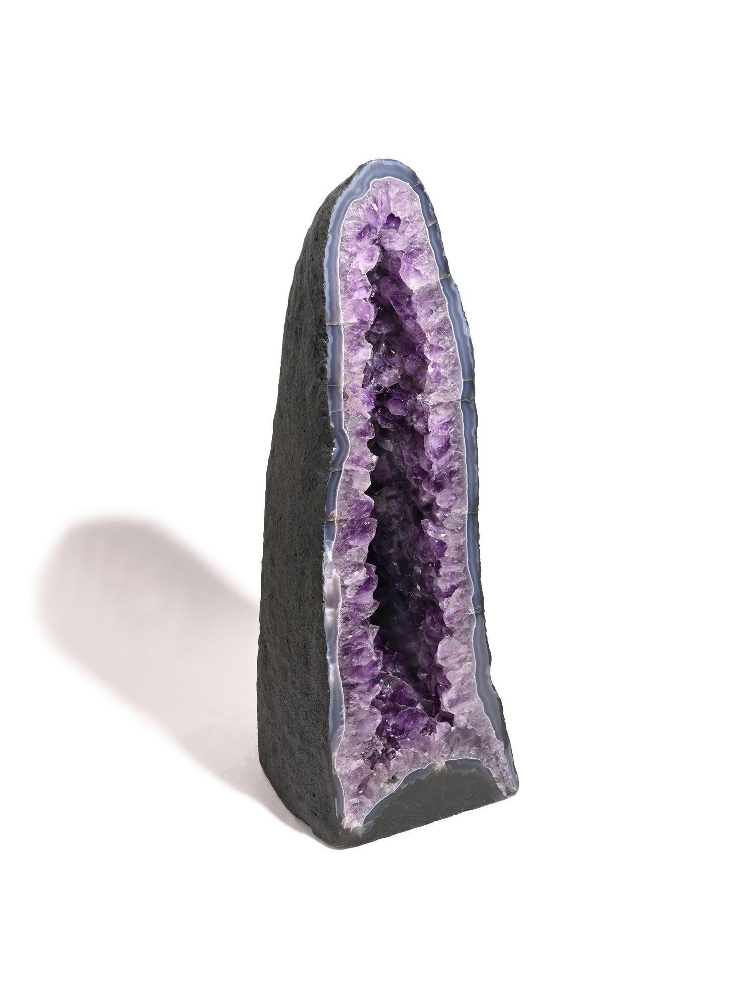 Incredibly beautiful and soothing, Amethyst Caves, or Amethyst Cathedrals, are geodes cut in half and opened to reveal a mesmerizing landscape of purple amethyst. These unusually tall and curvy-shaped stones are painted calming charcoal gray on the backside.