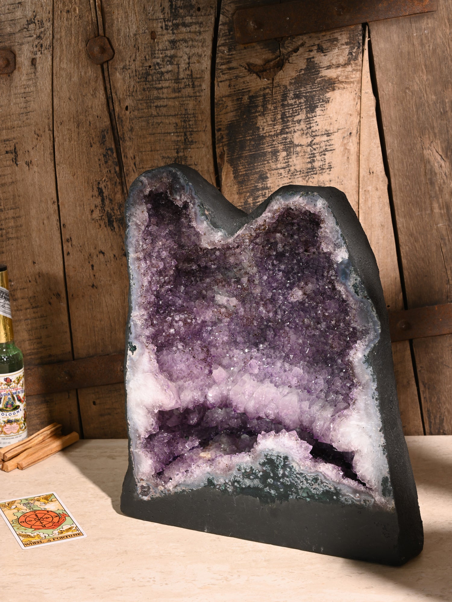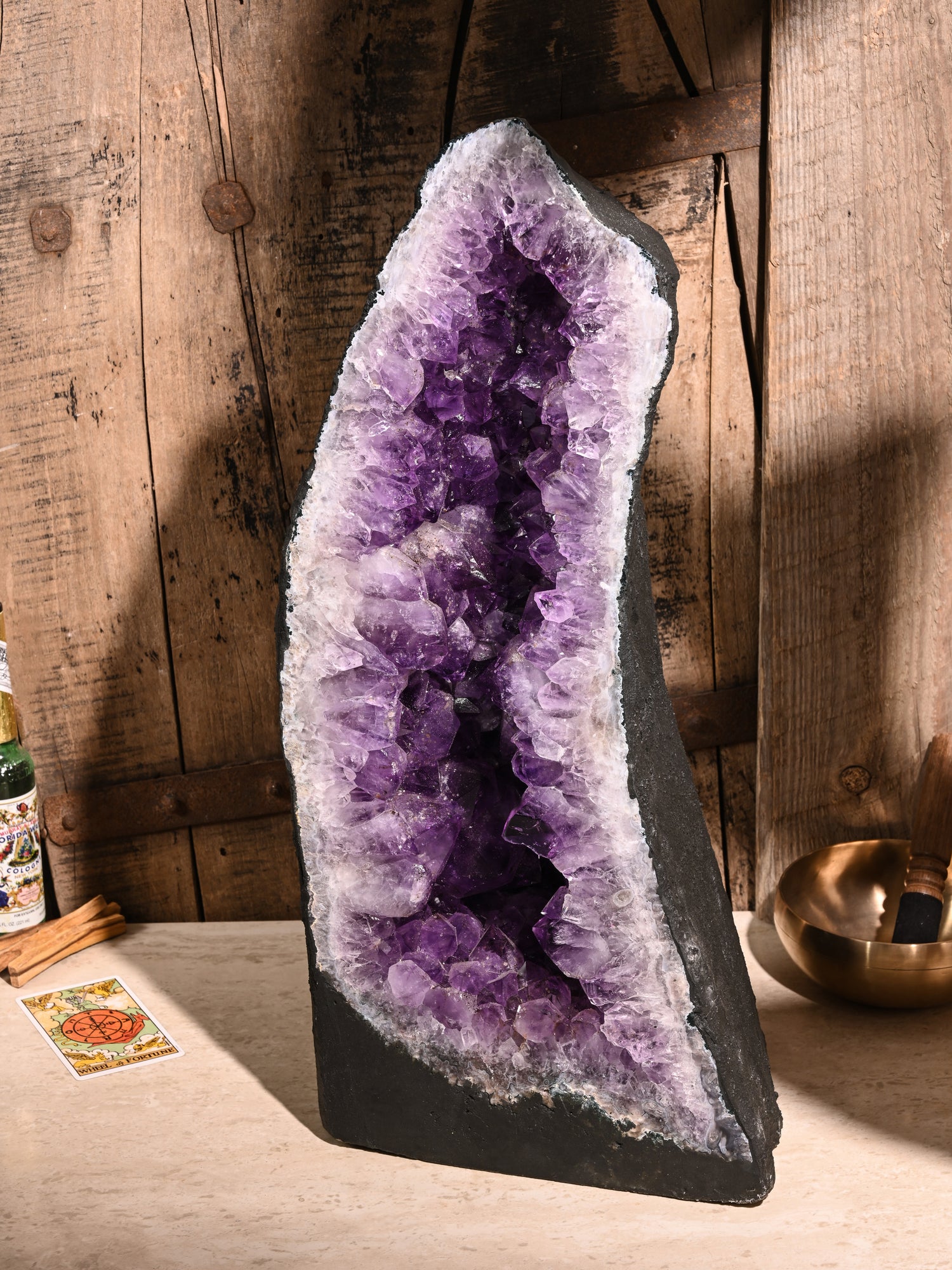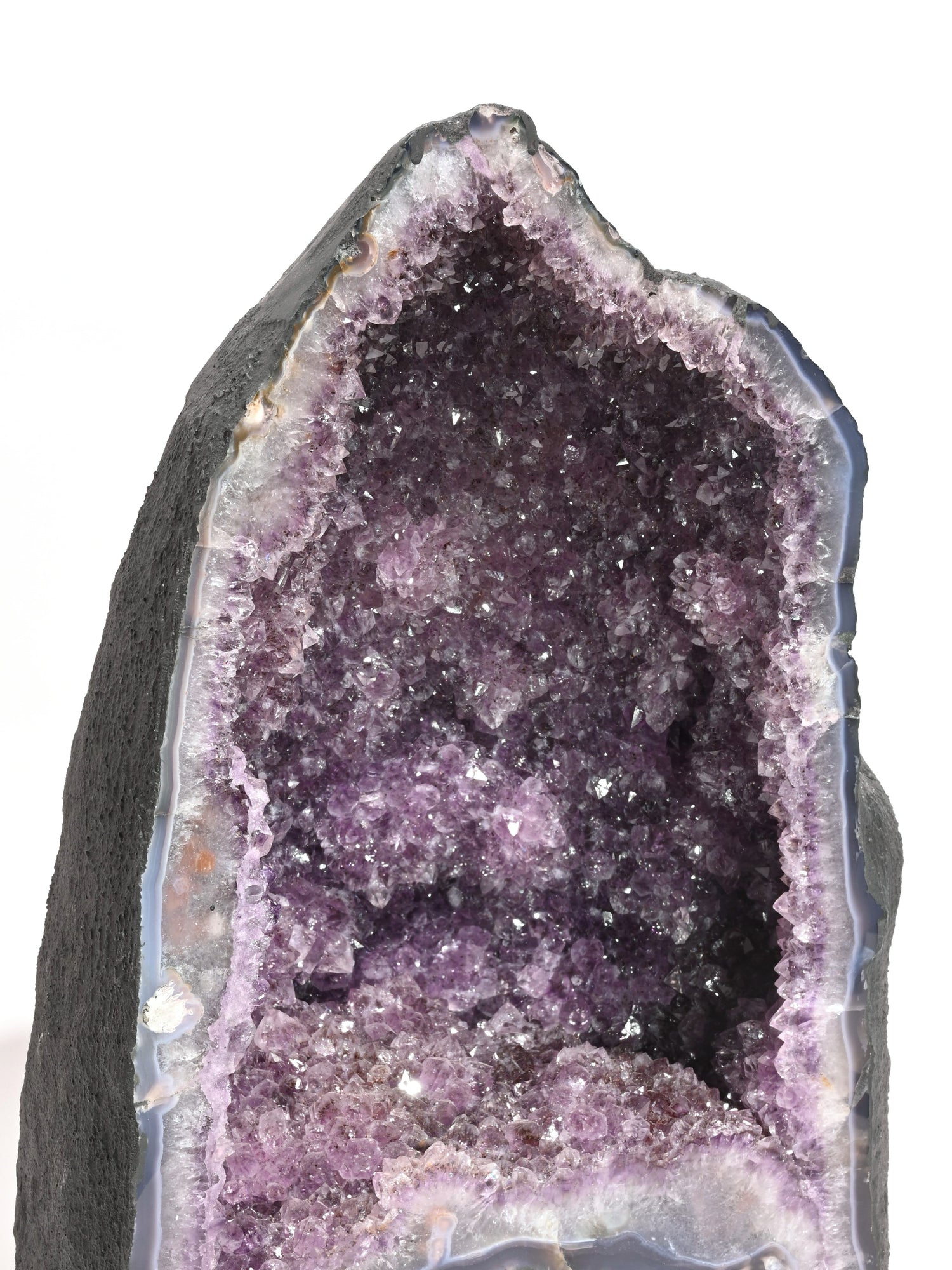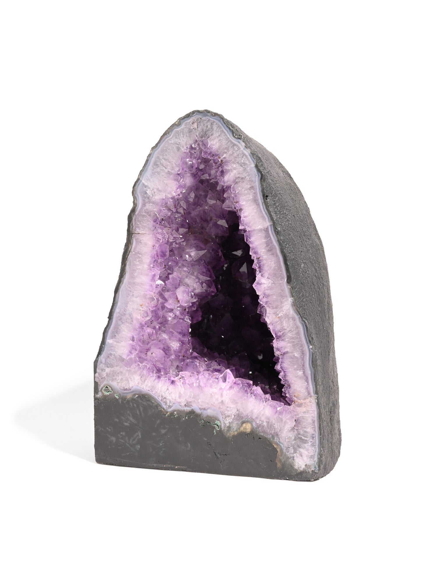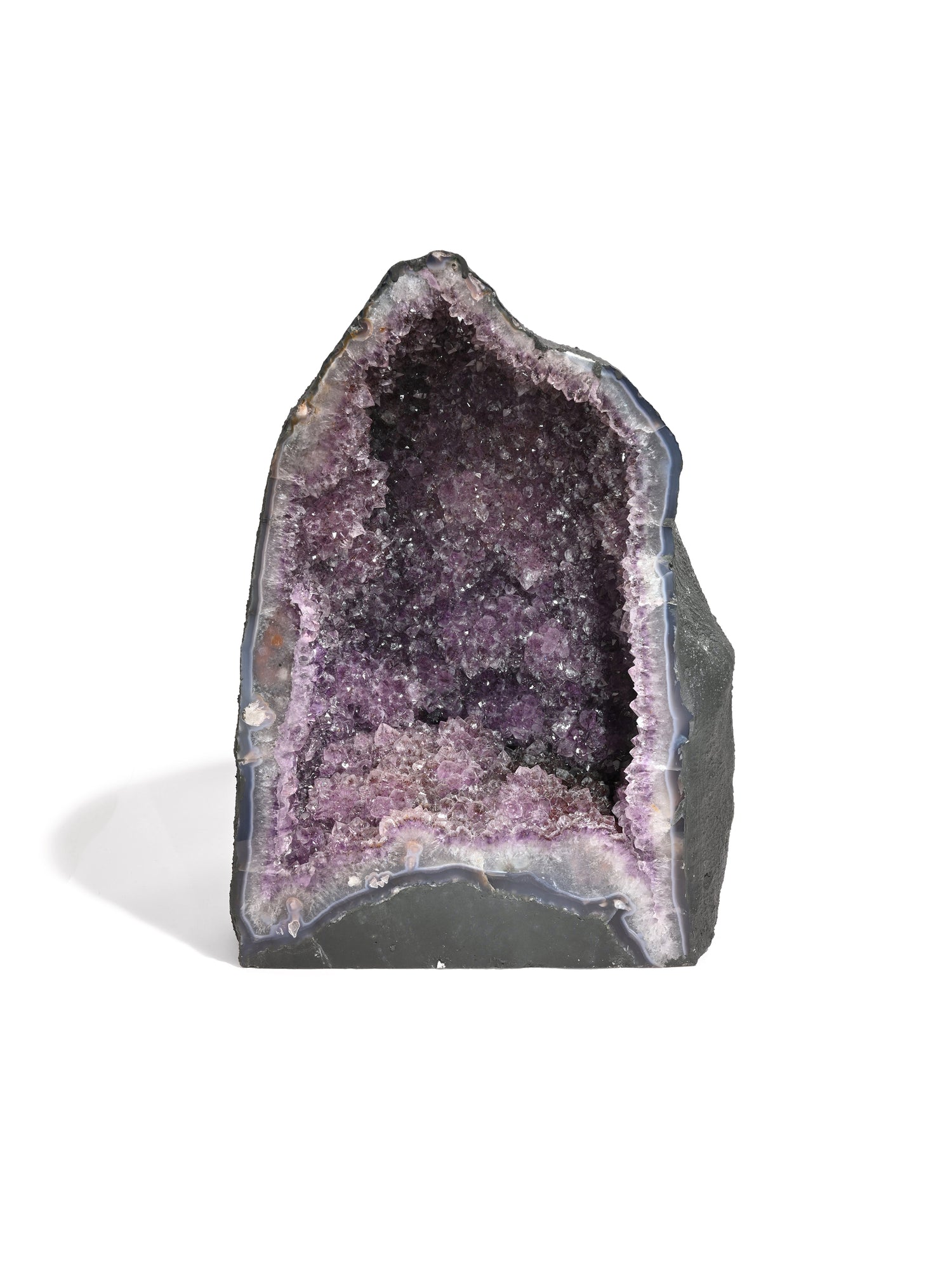 Incredibly beautiful and soothing, Amethyst Caves, or Amethyst Cathedrals, are geodes cut in half and opened to reveal a mesmerizing landscape of purple amethyst. These unusually tall and curvy-shaped stones are painted calming charcoal gray on the backside.