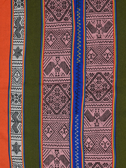 This sturdy mestana cloth is hand woven and features traditional Chincheros motifs in its bands. The designs are woven to produce an image with positive color and weave effect on one side and opposite color and weave effect of the same image on the reverse, making it beautiful on both sides. Makes a fitting mestana or altar cloth.