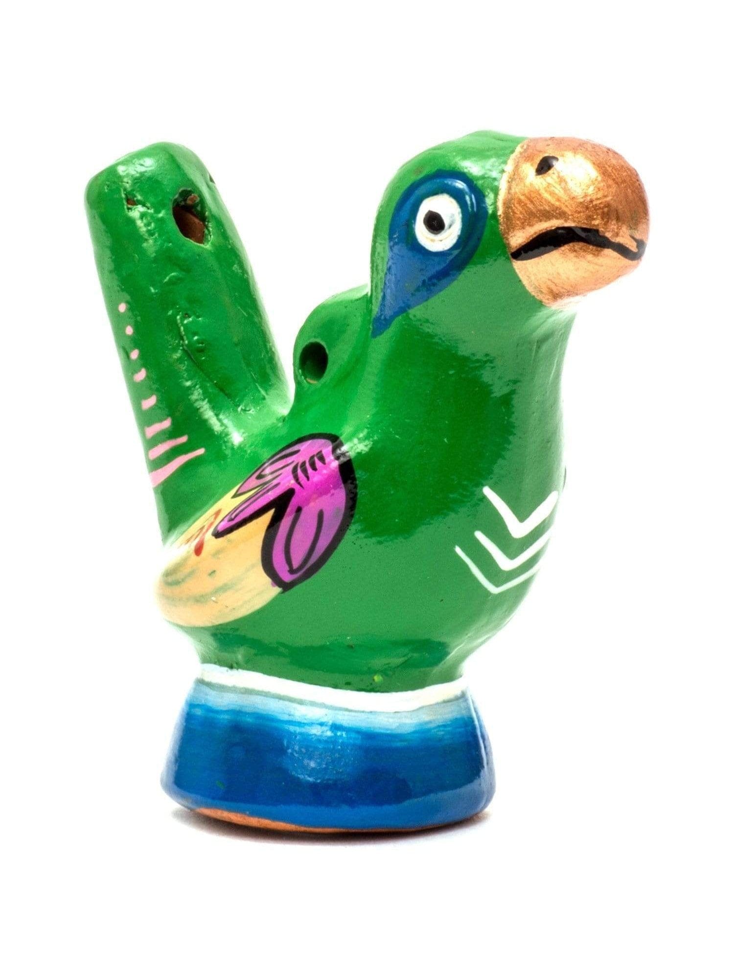 Hand made in Peru, our clay sculpted bird-shaped miniature whistling vessels can chirp like a bird! Simply fill the piece with water in the hole at the top of the head and then blow through the hole in the tip of the tail. Hole in the back of the neck for your own cord. Perfect as a gift or as a decoration!
