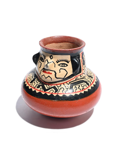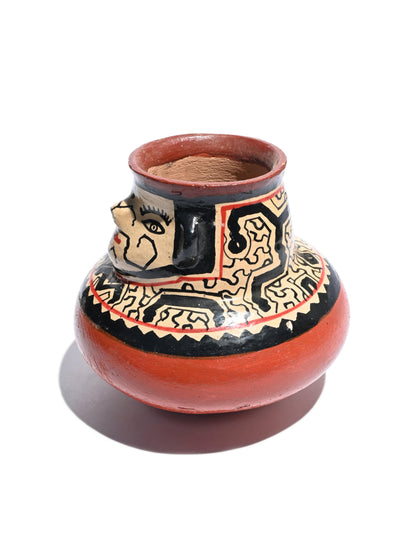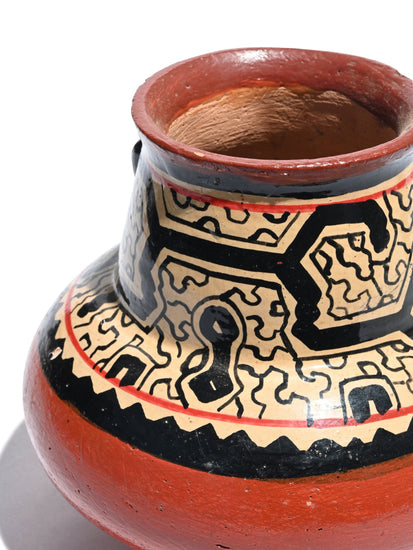 The Shipibo people live near the Ucayali River in areas of eastern Peru in the Amazon Basin. These natives are extremely talented, making distinctive pottery that is traditional for their lifestyle. Shipibo vases and bowls are handmade and decorated using natural earth pigments. Their geometric designs are representations of their ayahuasca visions, making this type of pottery so unique and prized. After the pottery pieces are created, decorated they are fired at low heat in open fires. After firing, the pieces are finished with a vegetable-based compound that makes them waterproof while creating a gorgeous sheen. The sides of the pottery are thin, making each piece amazingly lightweight. After the pieces have dried in the warm sun for several days, the clay goes through the firing process. The white base color is created from a clay slip whereas the red and black geometric designs come from the process of boiling bark. Resin obtained from tree sap gives Shipibo pottery its unique glaze.