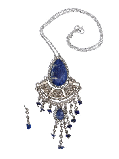 Stones on both sides. The pendant hangs 5 inches. Lobster claw closure. Hand-worked silver from Peru.