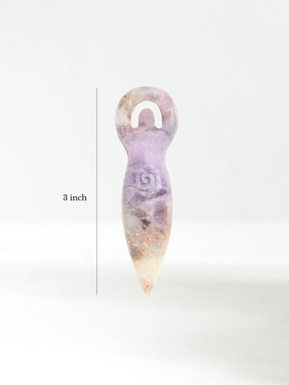 The Spiral Goddess is a symbol of feminine power, fertility, celebration, and surrender. Each palm-sized goddess is unique in shape and size. The skillfully carved spirals represent cycles, journeys and even the continuous cycle of life itself.