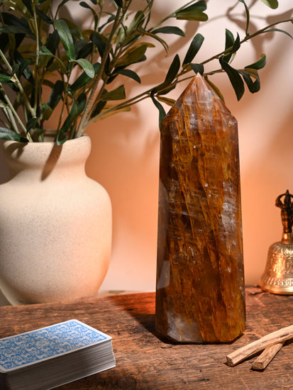 Polished into an elegant tower, this crystal acts as a focused energetic point, directing its harmonizing frequency upward and outward. Golden Healer is cherished for its ability to encourage emotional clarity, promote inner peace, and support holistic healing on all levels—mind, body, and spirit.