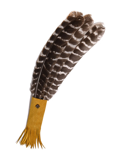 Prayer fans are commonly given as a gift to heal the heart. Just as ancient Americans used the feathers to send prayers to the heavens and draw healing power from the sky, so with all sincerity we hope such healing accompanies you with every footstep. This leather-wrapped handle prayer fan is finished with a turquoise or an abalone bead.