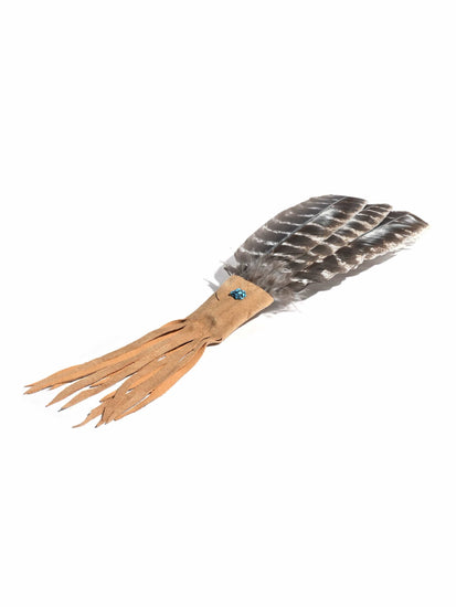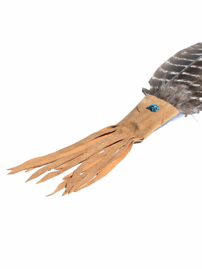 Prayer fans are commonly given as a gift to heal the heart. Just as ancient Americans used the feathers to send prayers to the heavens and draw healing power from the sky, so with all sincerity we hope such healing accompanies you with every footstep. This leather-wrapped handle prayer fan is finished with a turquoise or an abalone bead.