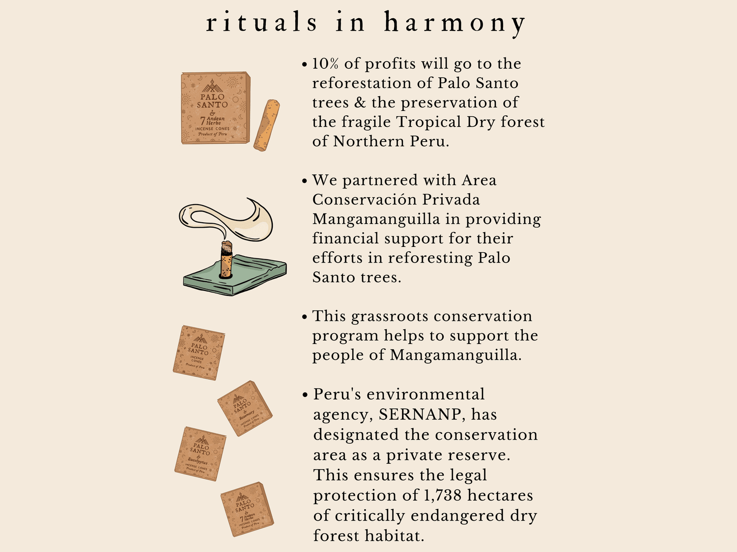 10% of profits from the sales of the Palo Santo Cones will go to the reforestation of Palo Santo trees and the preservation of the fragile Tropical Dry forest of Northern Peru. Our partner, Area Conservación Privada Mangamanguilla, is reforesting Palo Santo trees in the rare and diverse ecosystem that is home to Palo Santo – holy wood (Bursera Graveolens) with the support of your purchase.